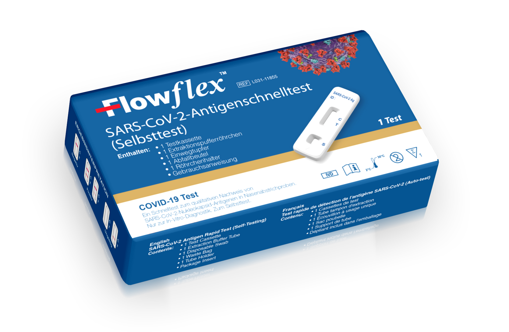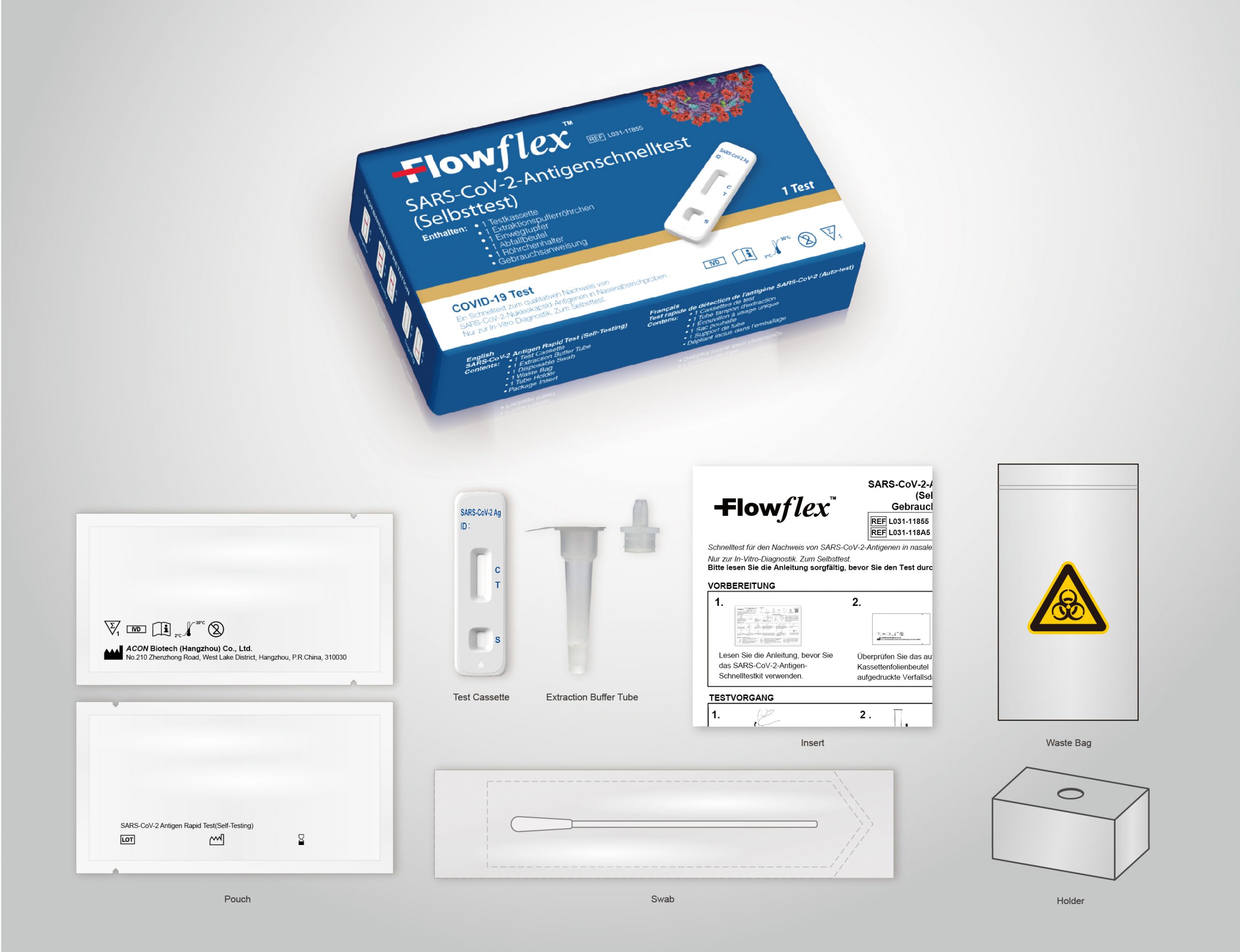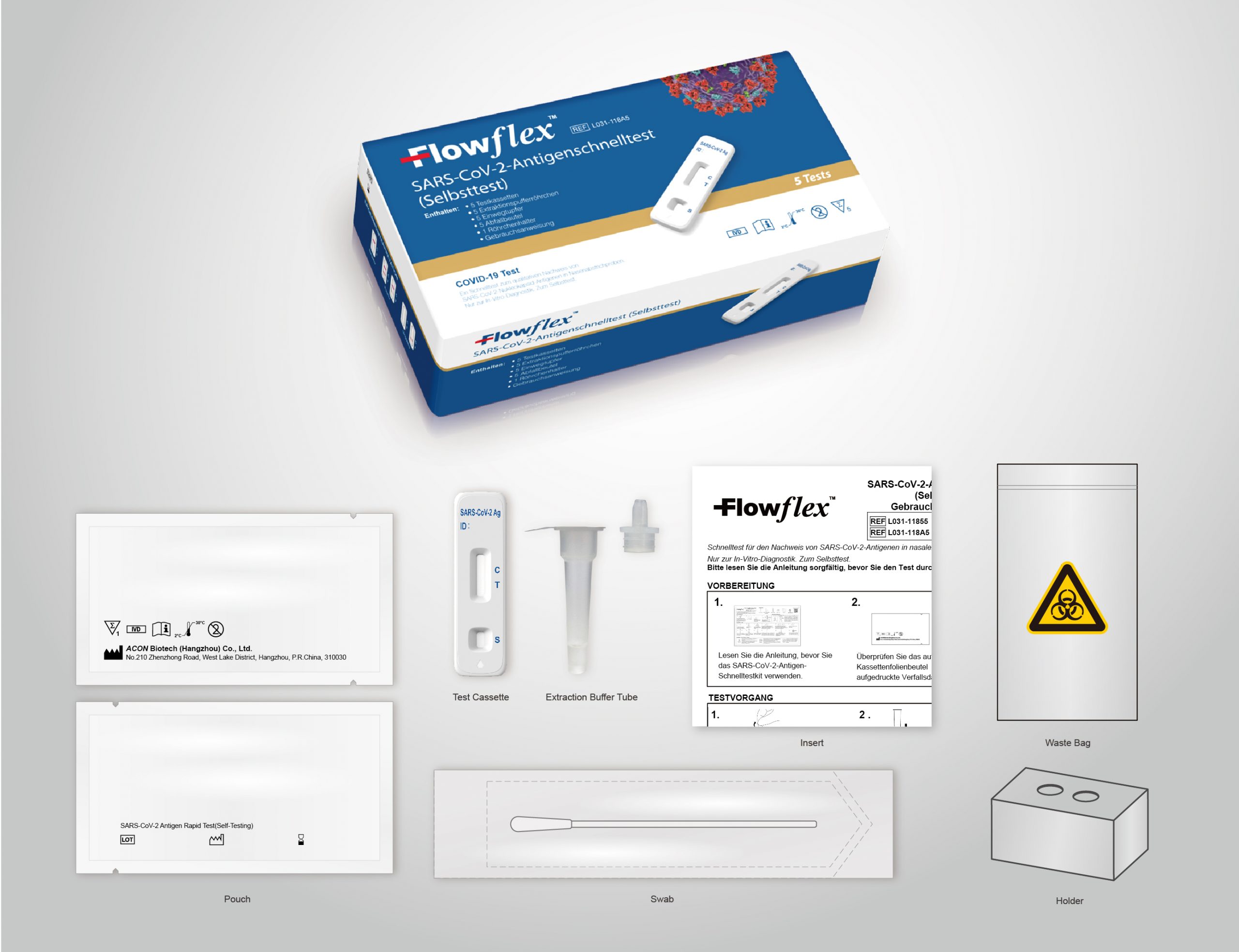 - Inhalt: Testkassetten, Puffer, Extraaktionsröhrchen mit integrierten Dosierspritzen,steriler Probenentnahme-Tupfer, Packungsbeilage