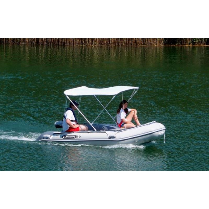 Klappbares Bimini-Sonnenverdeck mit zwei Bögen. Rahmen aus eloxiertem Aluminium – 20 mm Durchmesser. Gelenke und Montagebasis aus verstärktem Nylon. Sonnendach aus Polyestergewebe. Max. Fahrgeschwindigkeit: 30km/h.