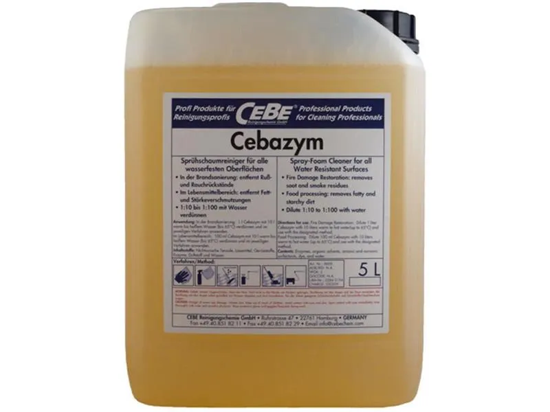 Cebazym ist ein neutrales, enzymatisches Reinigungsmittel, welches für die Reinigung aller wasserfesten Oberflächen entwickelt wurde. Es enthält eine Kombination von Enzymen, welche Proteine, Stärken und Fette wasserlöslich machen. Das Produkt ist ideal für die Reinigung in verschiedenen