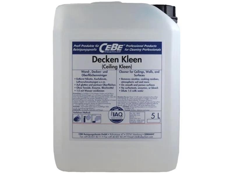 Das Produkt enthält keine Tenside, Enzyme, Bleichmittel, Alkalien und Lösemittel. Decken Kleen entfernt Verschmutzungen wie Nikotin, Kochdünste, Beläge durch Luftverschmutzungen u.v.m. von porösen sowie glatten Oberflächen wie zum Beispiel Akustikdecken (Mineralfaserdecken), Kunststoffe, Eloxal, Panele etc. Decken Kleen wird 1:5 (1 Liter Decken Kleen mit 5 Liter Wasser) mit Wasser verdünnt und auf die zu behandelnden Flächen