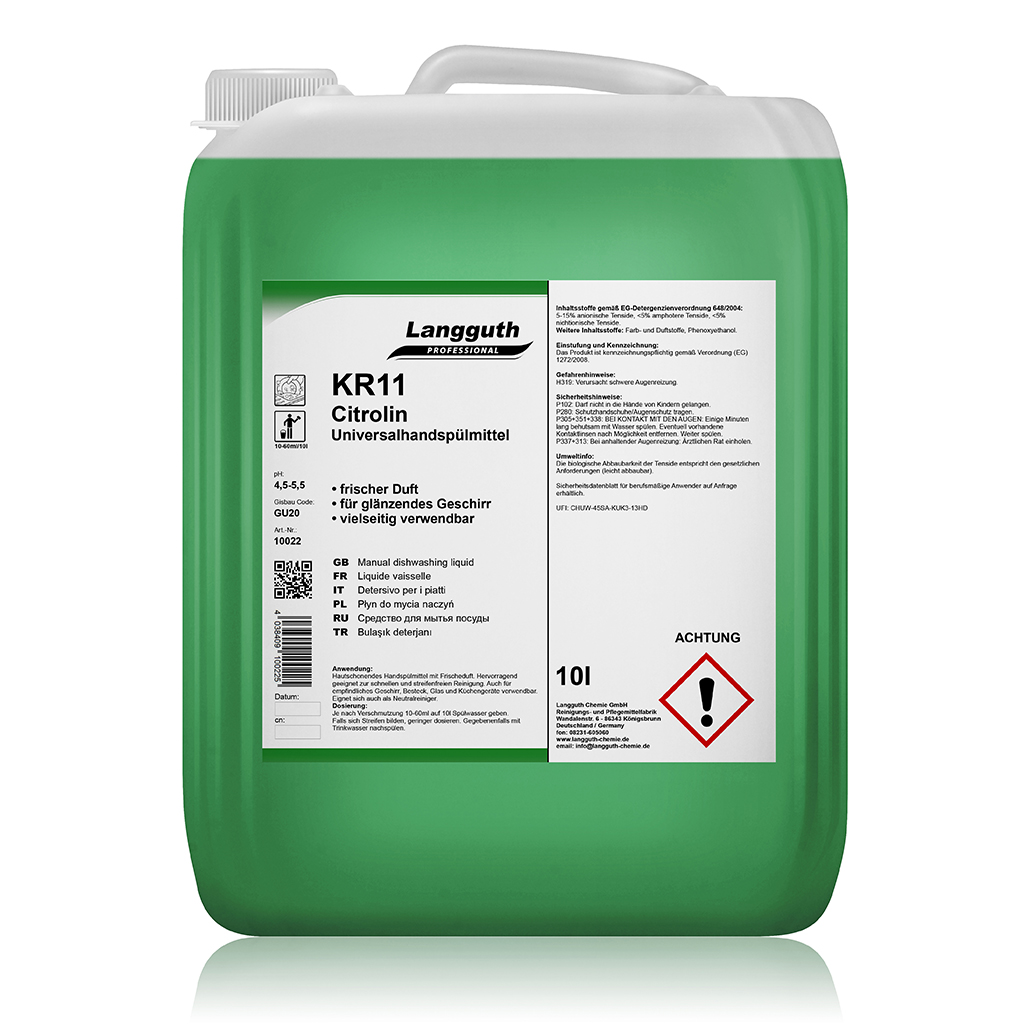 Vielseitig zu verwendendes konzentriertes Produkt. Hervorragend geeignet zur schnellen Reinigung von Geschirr, Besteck, Glas und Küchengeräten. Auch als Universal- und Neutralreiniger für die Reinigung von Hartoberflächen geeignet. KR11 Citrolin ist hautschonend und reinigt streifenfrei.