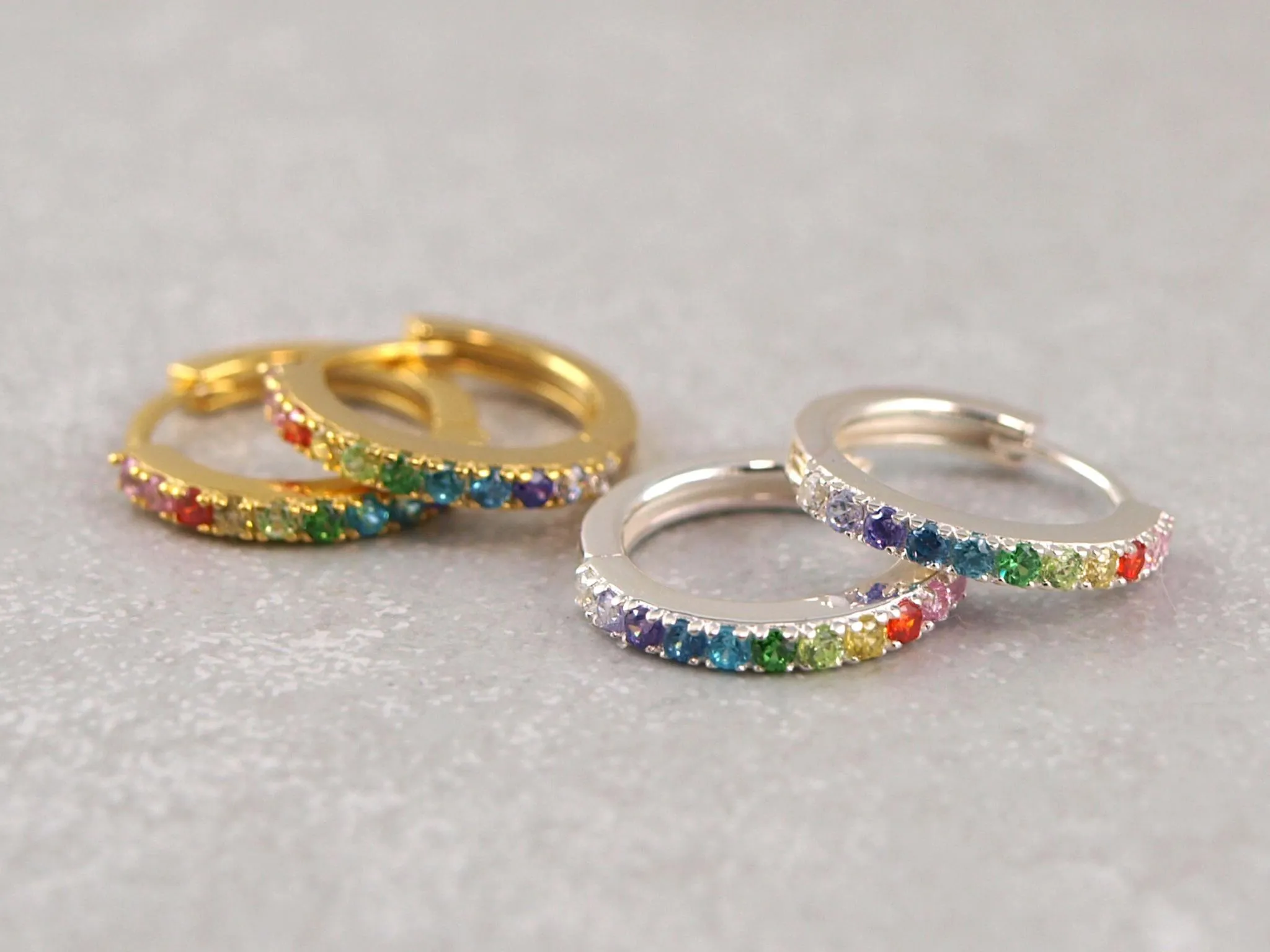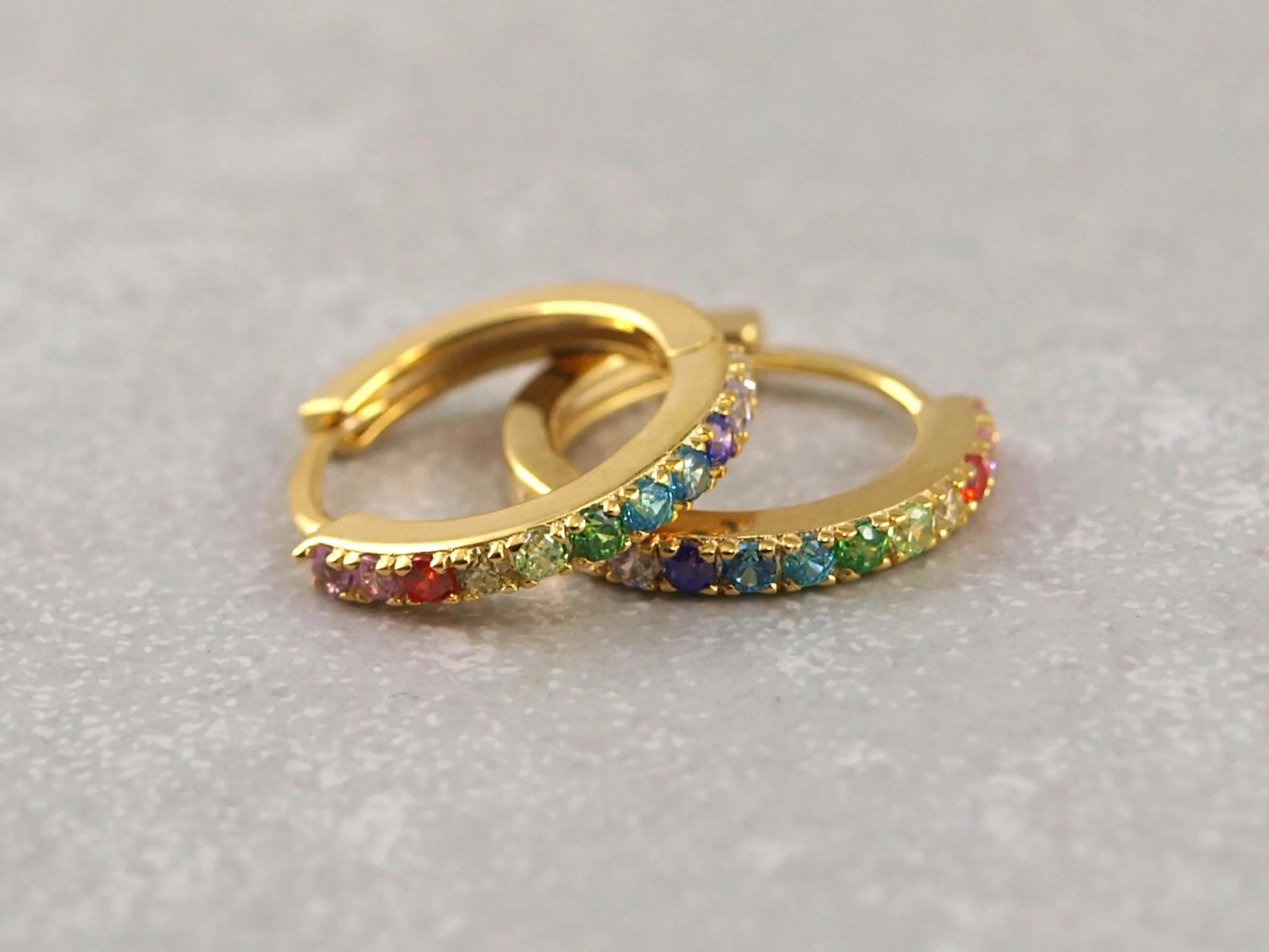 Diese wunderschönen Kreolen bestehen aus hochwertigem Silber oder sind vergoldet. Verschiedene bunte Zirkon-Steine sind im Regenbogen-Muster an den Kreolen befestigt. Dadurch bekommen diese Ohrringe einen ganz besonderen Look und werden zu einem echten Hingucker! Die Kreolen werden durch einen einfachen Schnapp-Verschluss sicher geschlossen und haben einen Durchmesser von etwa 13 mm.