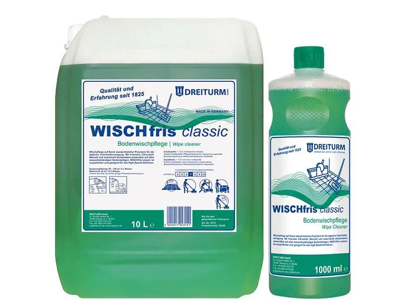 Wischpflege auf Basis wasserlöslicher Polymere für die tägliche Unterhaltsreinigung. Mit frischem Citrusduft. Manuell und maschinell (Automaten) anwendbar auf allen wasserbeständigen Bodenbelägen. WISCHfris classic Bodenwischpflege ist auspolierbar und geeignet für das High-Speed-Verfahren.