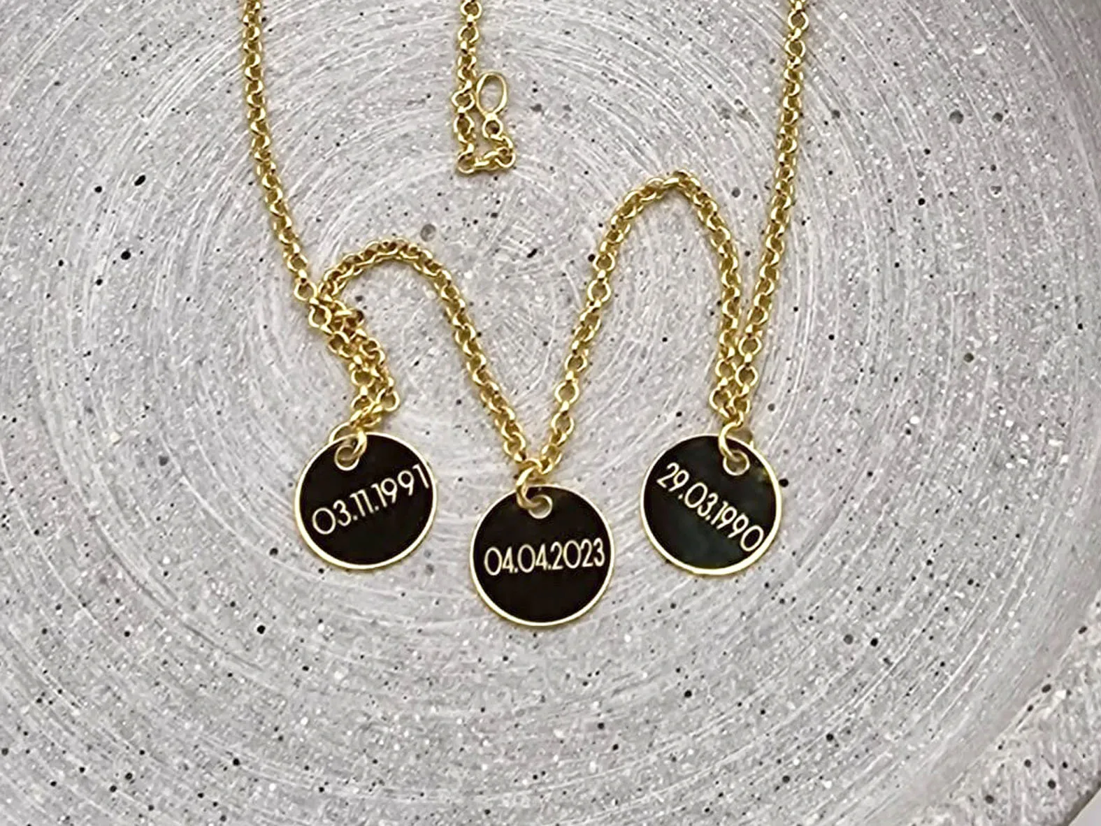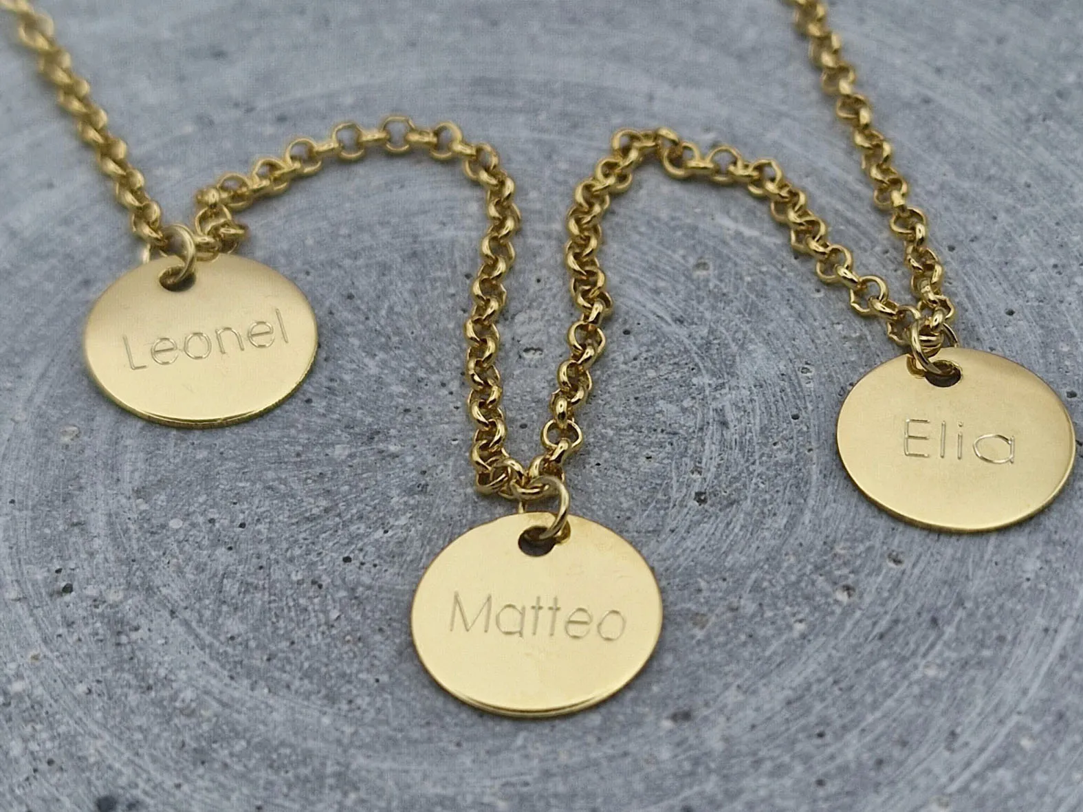 Diese echt goldene Familienkette besteht aus einer Kette mit drei Gravur-Anhängern