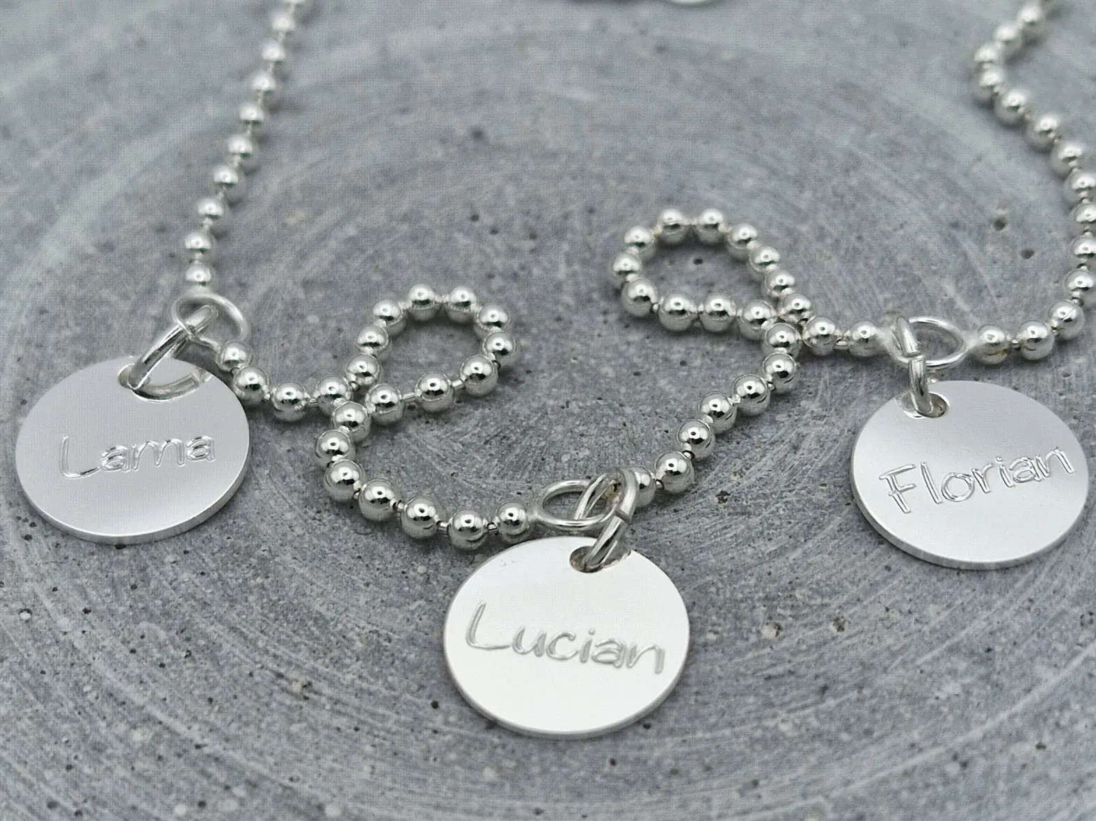 Familienkette aus Silber mit drei runden Gravur-Anhängern, Kugelkette, Namenskette