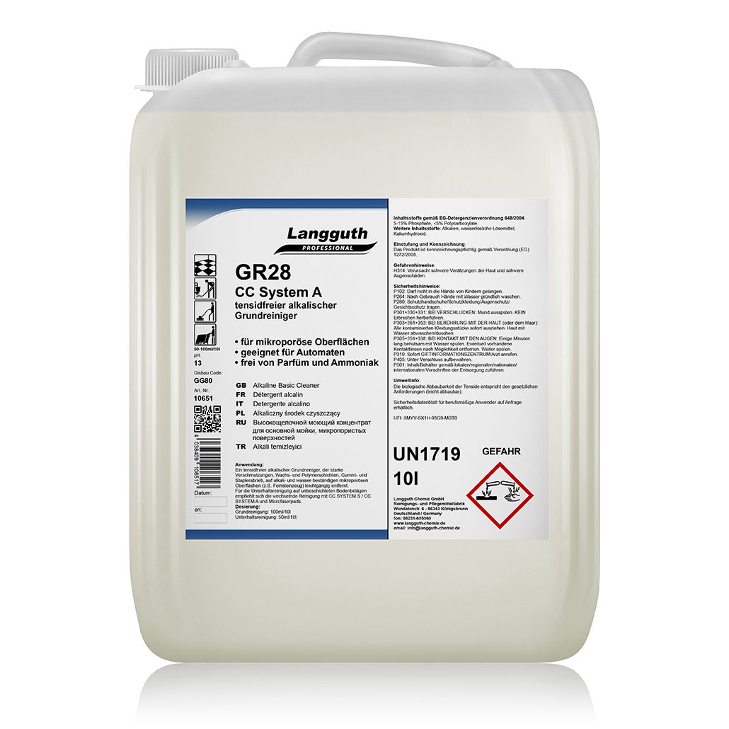 CC System A ist ein tensidfreier alkalischer Grundreiniger, der rückstandsfrei, automaten geeignet, starke Verschmutzungen, Wachs- und Polymerschichten, Gummi- und Staplerabrieb, auf alkali- und wasserbeständigen mikroporösen Oberflächen (z.B. Feinsteinzeug) leichtgängig entfernt.