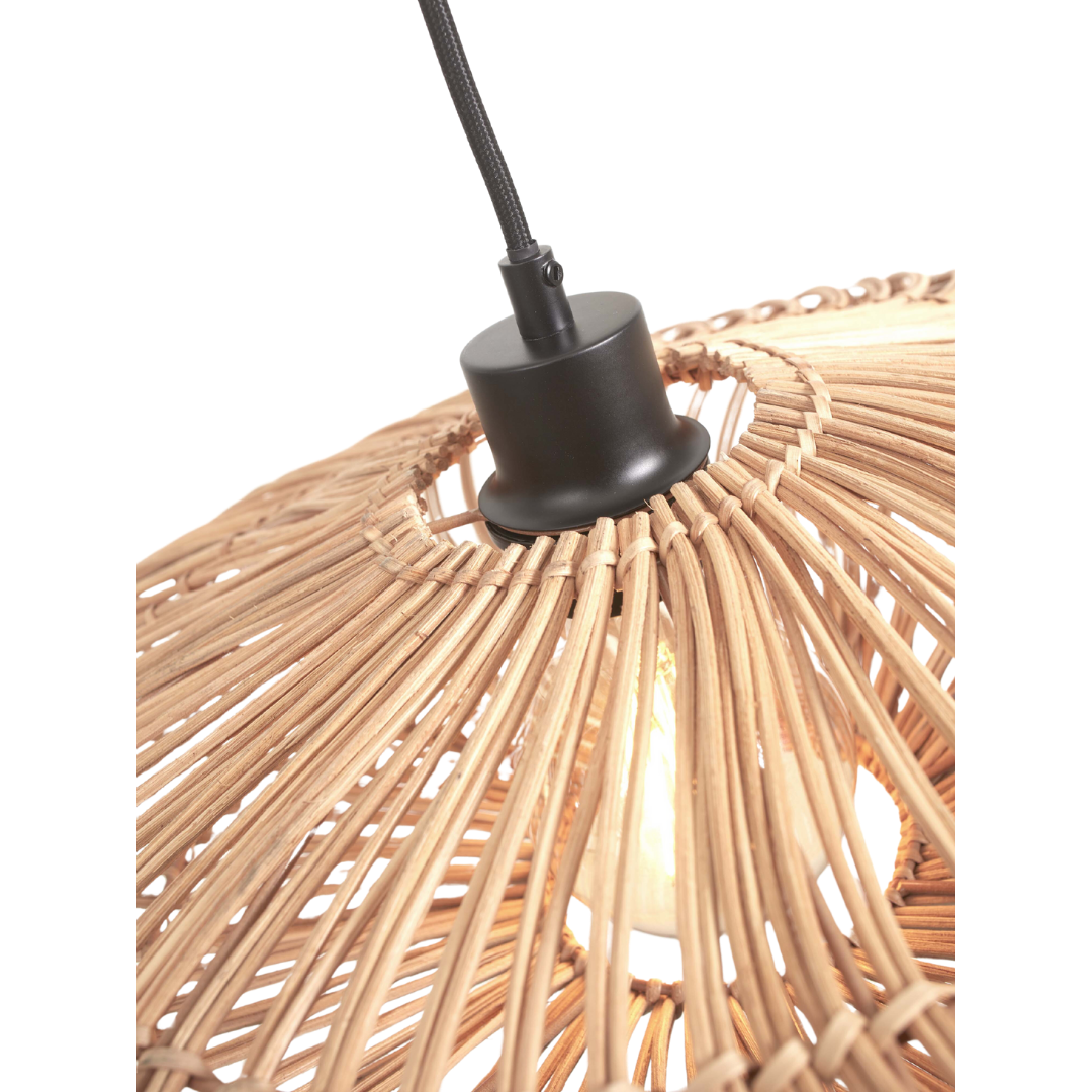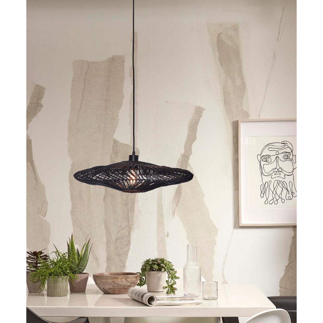 Die Hängelampe Zanzibar flach 55×14 von GOOD&MOJO verbreitet ein weiches, angenehmes Licht und schafft so eine entspannte und harmonische Atmosphäre in deinen Räumen. Die flache Lampe besteht aus strapazierfähigem Rattan und ist in jedem Raum ein echter Hingucker. Die Größe L mit einer Höhe von 14 cm verleiht deinem Wohn- oder Schlafzimmer eine frische und moderne Atmosphäre. Diese einzigartige Lampe wurde sorgfältig aus einer Mischung aus Metall und Rattan gefertigt und ist in drei Farben erhältlich: Schwarz, Natur und Weiß