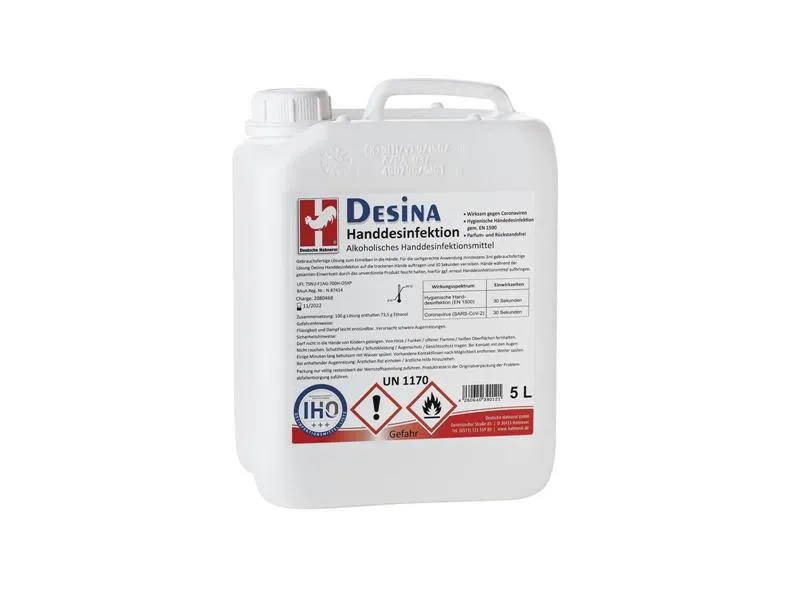 Für die sachgerechte Anwendung mindestens 3ml gebrauchsfertige Lösung Desina Handdesinfektion auf die trockenen Hände auftragen und 30 Sekunden verreiben. Hände während der gesamten Einwirkzeit durch das unverdünnte Produkt feucht halten, hierfür ggf. erneut Handdesinfektionsmittel aufbringen. Unsere professionellen Desinfektionsmittel sind aufgeführt in der Desinfektionsmittelliste des Industrieverbandes Hygiene und Oberflächenschutz (IHO). Wirkungsspektrum: Hygienische Handdesinfektion (EN 1500) – 30sec. Coronavirus (SARS-CoV-2) – 30sec.