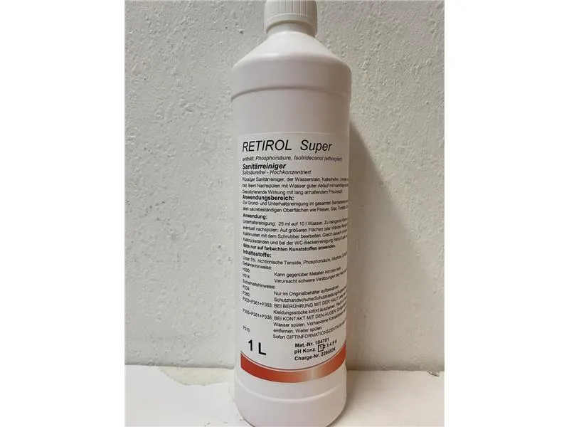 Hahnerol Retirol Super ist ein flüssiger Sanitärreiniger mit selbsttätiger Glanztrocknung.