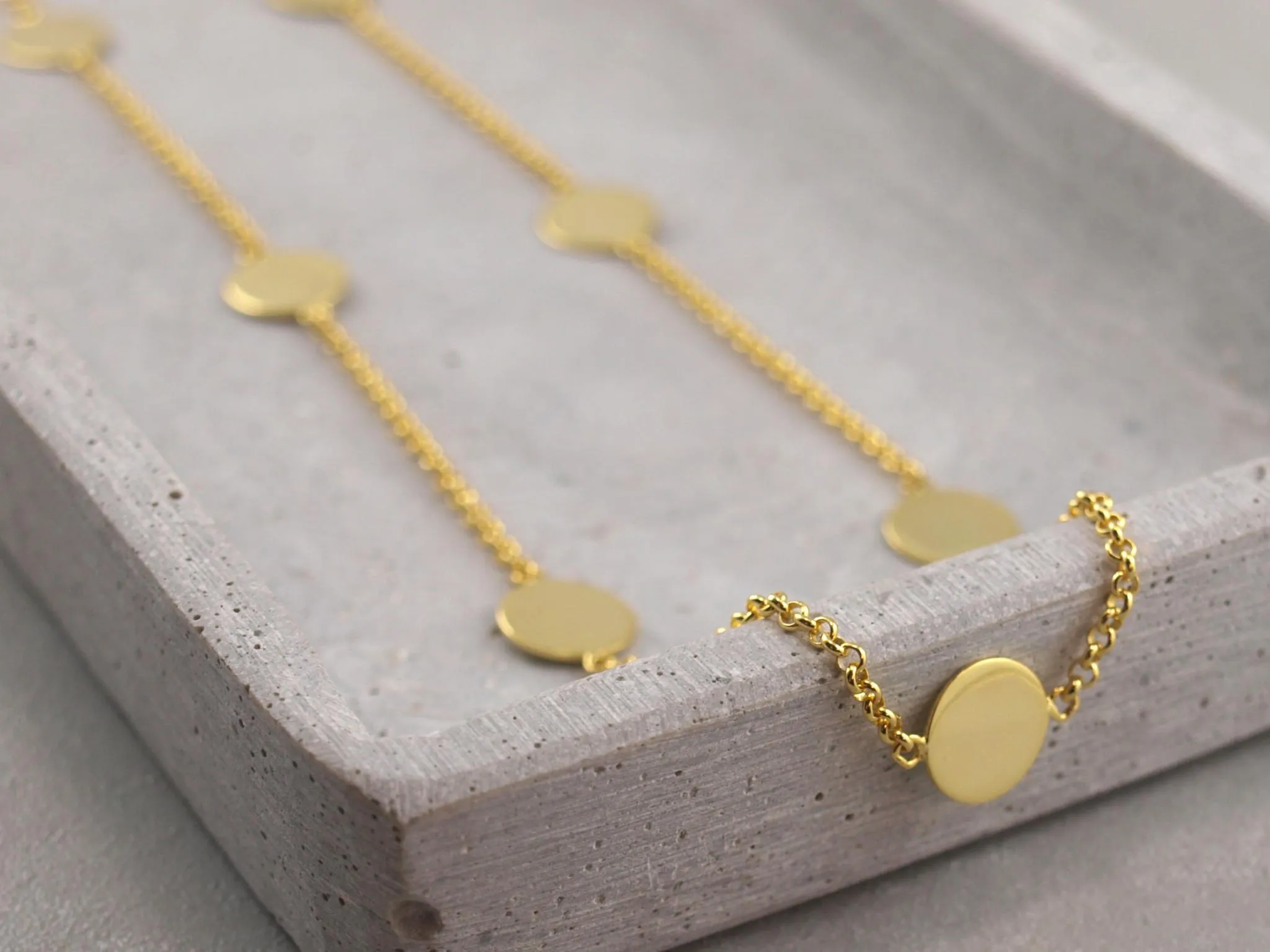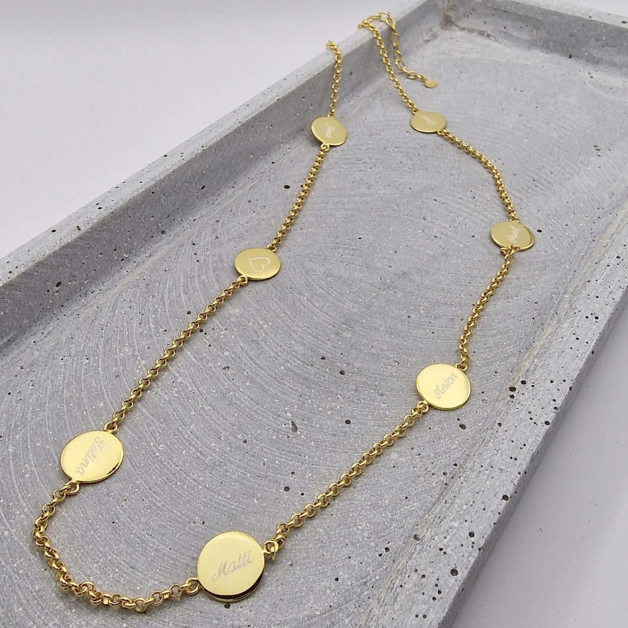 Diese moderne Familien-Kette aus vergoldetem 925er Silber mit Gravur-Anhängern in Form von kleinen, runden Plättchen ist etwas ganz Besonderes. Lassen Sie für jedes Enkelkind, jedes Kind oder jeden Lieblingsmenschen einen Anhänger gravieren. Sie haben hier 7 Plättchen zur Verfügung. Natürlich sind auch die Namen Ihrer Vierbeiner möglich! Diese Kette mit Gravuranhängern ist die perfekte, persönliche Geschenkidee.