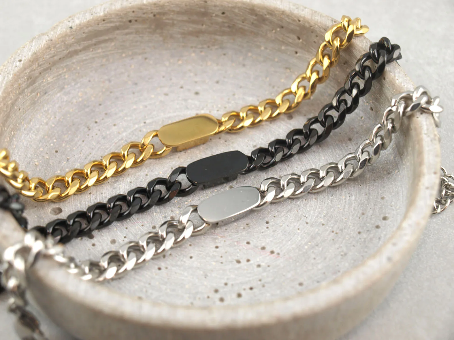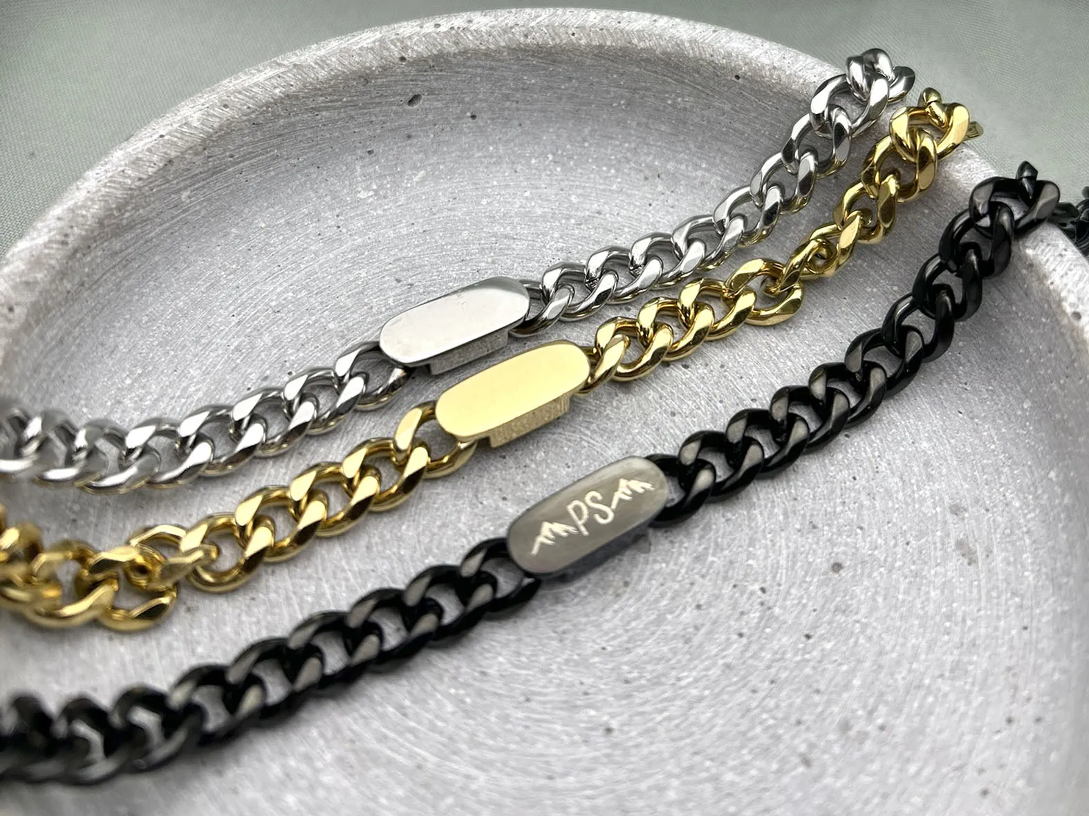 Dieses Armband wurde aus Titan gefertigt und ist somit ideal für Allergiker geeignet. Das Schild kann mit einer individuellen Gravur versehen werden und es besteht auch die Möglichkeit, in zwei Zeilen zu gravieren. Dieses Armband ist in verschiedenen Farben erhältlich: Schwarz, Gold und Silber.