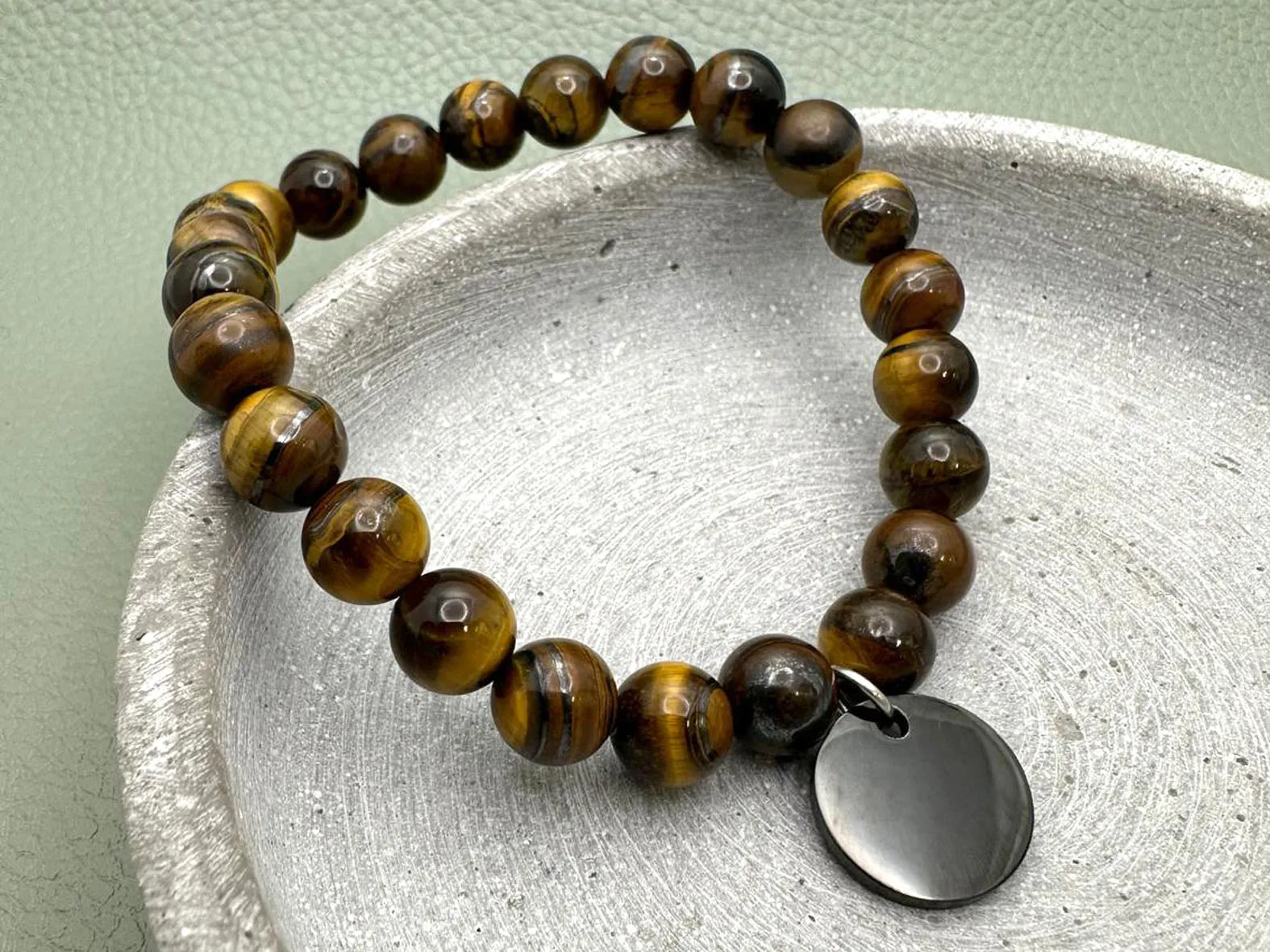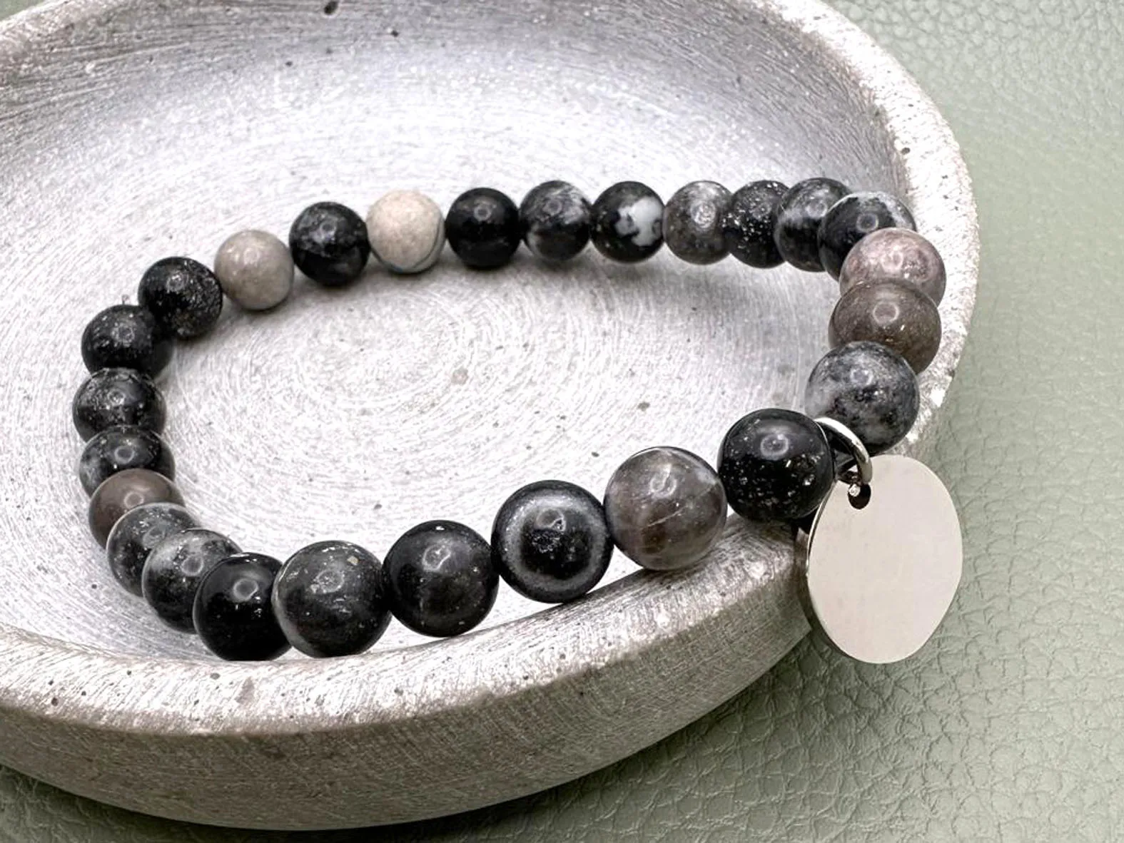 Aufgefädelt wird es auf einen elastischen Gummi, der das Aus- und Anziehen einfach macht. Auch hier fertigen wir gerne nach dem Umfang Ihres Handgelenks und gravieren den Gravuranhänger mit Ihrem Wunschtext.