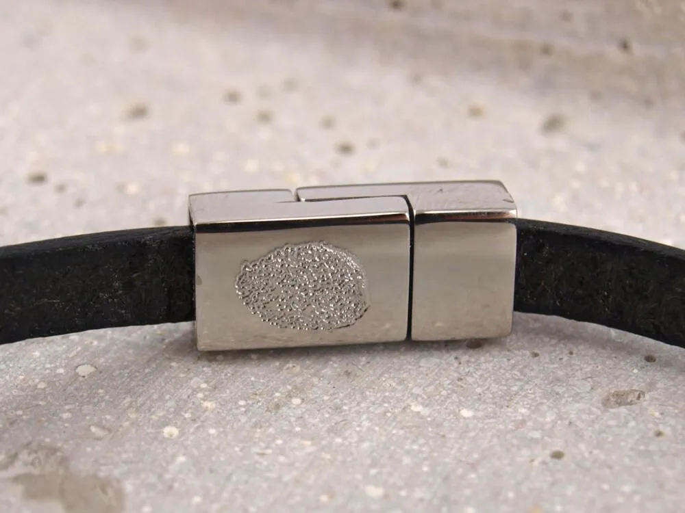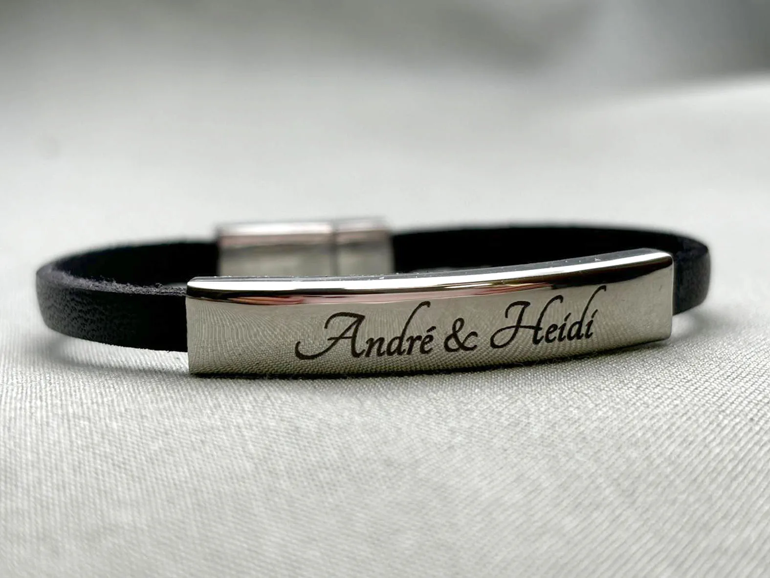 Das personalisierbare Lederarmband wird aus einem ca. 5 mm breiten Riemen aus echtem Rindsleder hergestellt. Sie können die Lederfarbe auswählen, Ihre gewünschte Größe angeben und Ihren individuellen Wunschtext bestimmen, den wir für Sie auf ein aufgeschobenes Edelstahlschild gravieren. Das Armband wird einfach und sicher mit einem Magnetverschluss aus Chirurgenstahl verschlossen. Der Verschluss kann sowohl auf der Innen- als auch auf der Außenseite mit einer individuellen Gravur versehen werden.