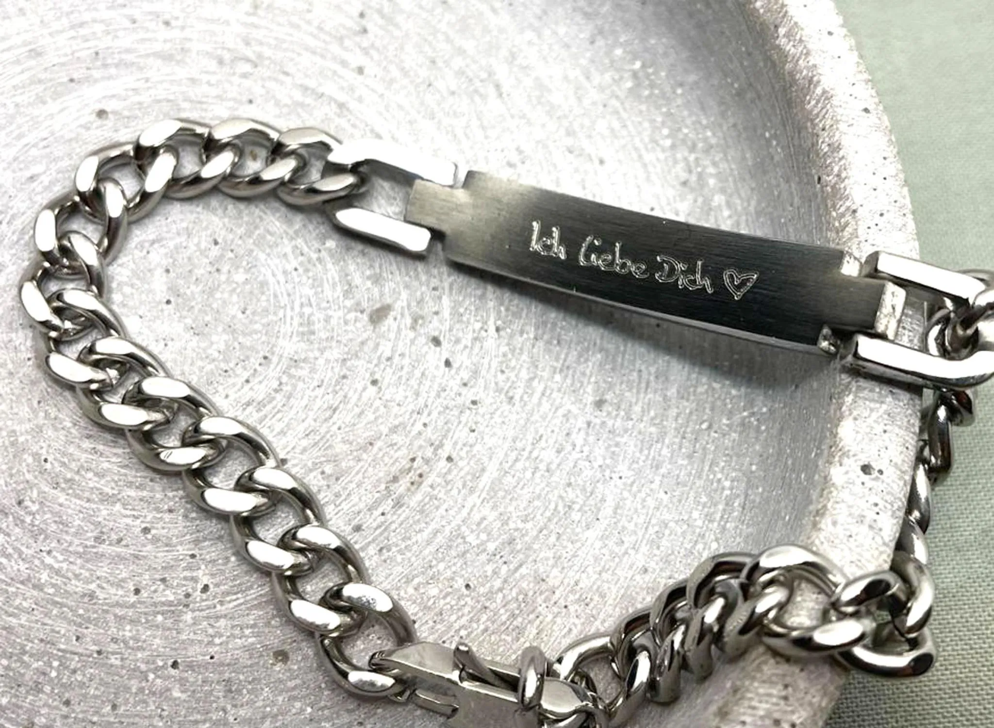 Dieses Armband wurde aus Titan gefertigt und ist somit auch für Allergiker geeignet. Das Schild kann mit einer individuellen Gravur versehen werden und es besteht auch die Möglichkeit, in zwei Zeilen zu gravieren. Dieses Armband ist in verschiedenen Farben erhältlich: Schwarz, Gold, Roségold und Silber. Das Armband eignet sich als Silber Armband für Herren.