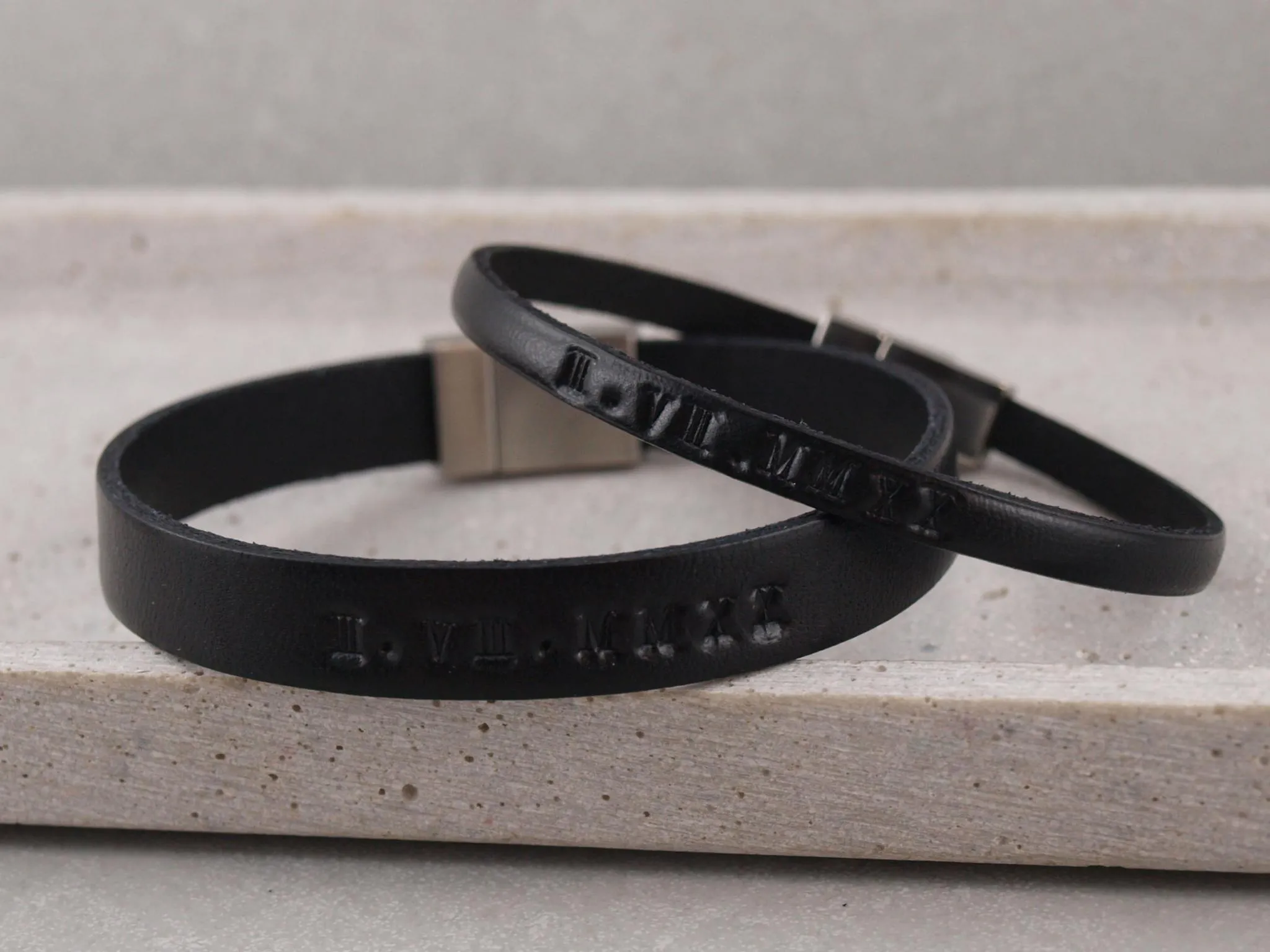 Partnerarmbänder aus Leder mit Gravur Optionen, ein schmales und ein breites Armband