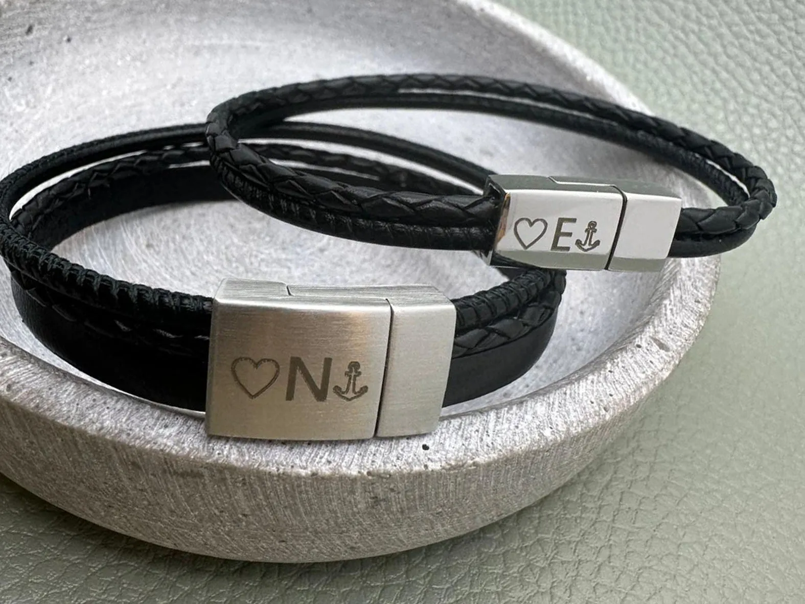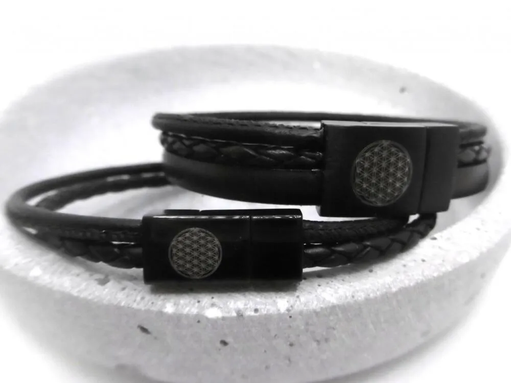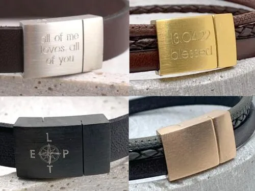 Dieses geflochtene Armband wird aus echtem Rindsleder gefertigt, das Rundleder ist aus Nappaleder. Das breitere Armband “Charlie” hat zusätzlich einen Rindslederriemen, der bestempelt werden kann. Das Armband wird mit einem hochwertigem eckigen Magnetverschluss aus Chirurgenstahl einfach und sicher geschlossen. Dieser ist auf der Außen- und Innenseite gravierbar.