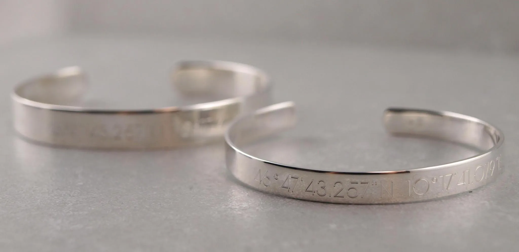 Suchen Sie eine romantische Geschenkidee als Zeichen der Zusammengehörigkeit? Lassen Sie die Koordinaten des Ortes der ersten Begegnung gravieren oder eine Geheime Liebes-Botschaft in Morse Zeichen. Wir gravieren Handschriften, Daten, römische Zahlen, Wunschtexte und Symbole. Auch individuelle Grafiken können auf dem Armreif auf der Innenseite oder der Außenseite graviert werden. Dieses Armspangen Set als Partnerarmband ist die persönliche Geschenkidee für Ihren Partner.